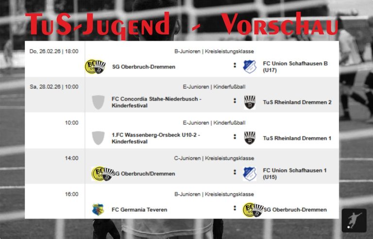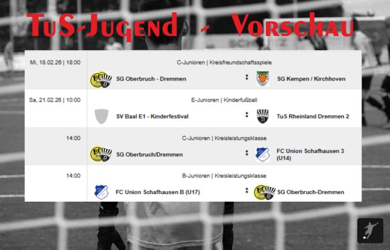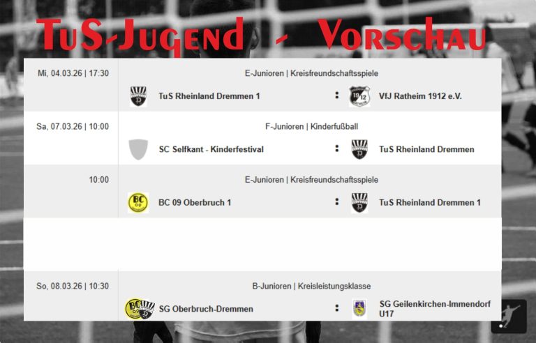 Die Teams des TuS Rheinland Dremmen stehen in den nächsten Tagen vor mehreren interessanten Begegnungen. Sowohl die E-Junioren als auch die F-Junioren sowie die C1 und C2-Junioren sind im Einsatz. Ein Überblick über die kommenden Spiele: