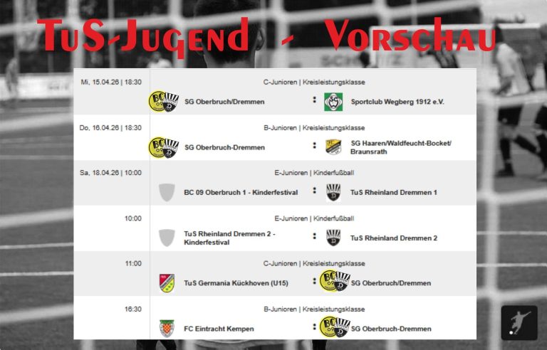 In den kommenden Tagen stehen für die Jugendmannschaften der SG Oberbruch-Dremmen und des TuS Rheinland Dremmen einige interessante Spiele an. Von Liga-Partien bis hin zu Freundschaftsspielen bietet das Wochenende jede Menge Fußballaction.