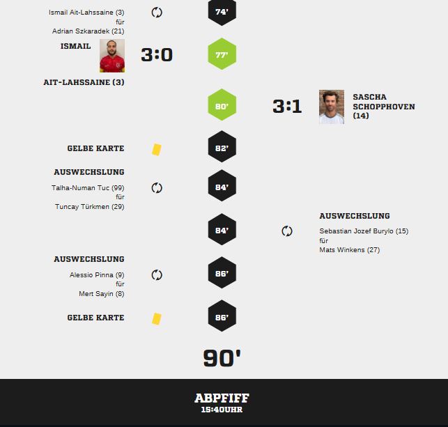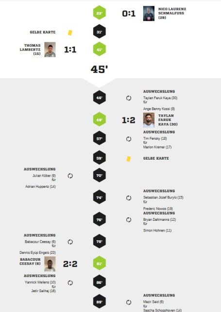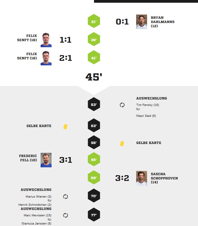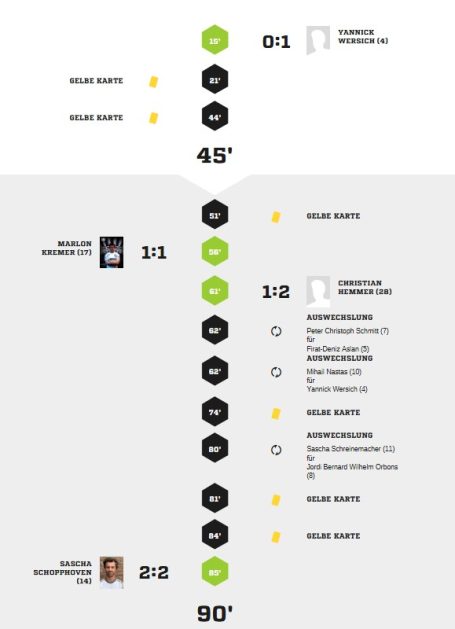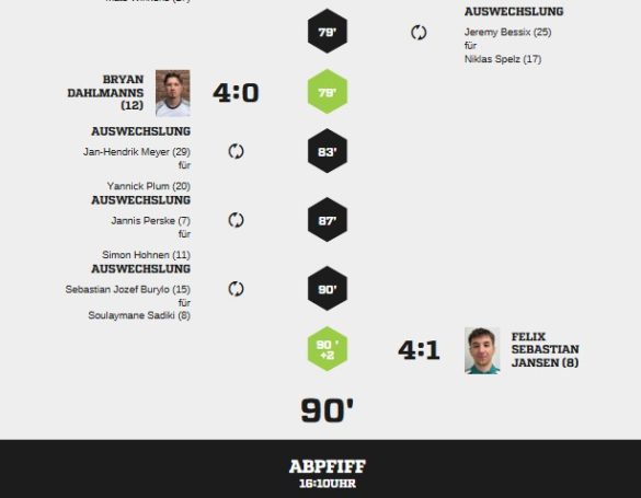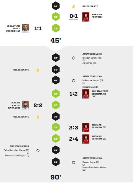 In der Schlussphase drehten die Gäste dann aber nochmal auf und sorgten durch zwei Tore von Thomas Schmidt in der 76. und in der 84. Minute für die 2:4 Führung der Gäste, was auch gleichzeitig der Endstand war.