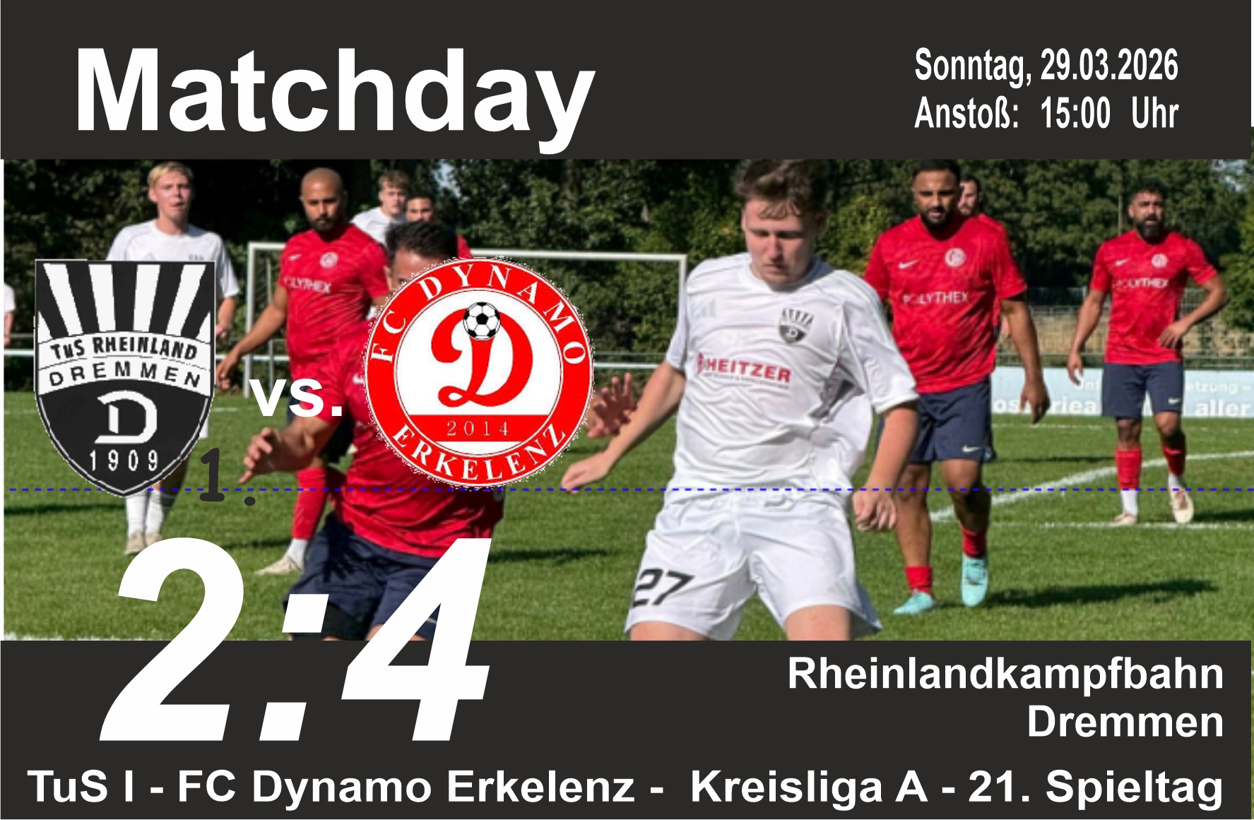 Die erste große Chance hatte der TuS. Der Kopfball von Banny Kossi landete aber an der Latte. Die rüttelte die Gäste wach. In der 31. Minute ein Elfmeter den Norman Post sicher verwandeln konnte. Der TuS hatte aber die passende Antwort. Fast im direkten Gegenzug erzielte Sebastian Burylo nach Freistoß von Benny Kossi den Ausgleich. Nach Foul an Kapitän Sascha Schopphoven kam der Freistoß von Kossi vors Tor der Gäste und Burylo war mit der Fußspitze am Ball und beförderte den Ball ins Tor. Kurz vor der Halbzeit eine Schrecksekunde, doch Torhüter Wilfried Hulsen hielt das 1:1 fest. Nur zwei Minuten später die nächste Großchance doch wieder vergaben die Gäste die Führung. Nach dem Wechsel machte Dynamo da weiter wo man aufgehört hatte. Nach einer weiteren vergebenen Chance war es dann Ron Manfred Eisermann, der nach 60 Minuten die Gäste in Führung brachte. Doch auch jetzt hatte der TuS die passende Antwort. Erneut war es eine Standardsituation. Mats Winkens brachte den Ball und Taylan Faruk Kaya war mit dem Kopf zur Stelle zum erneuten Ausgleich.