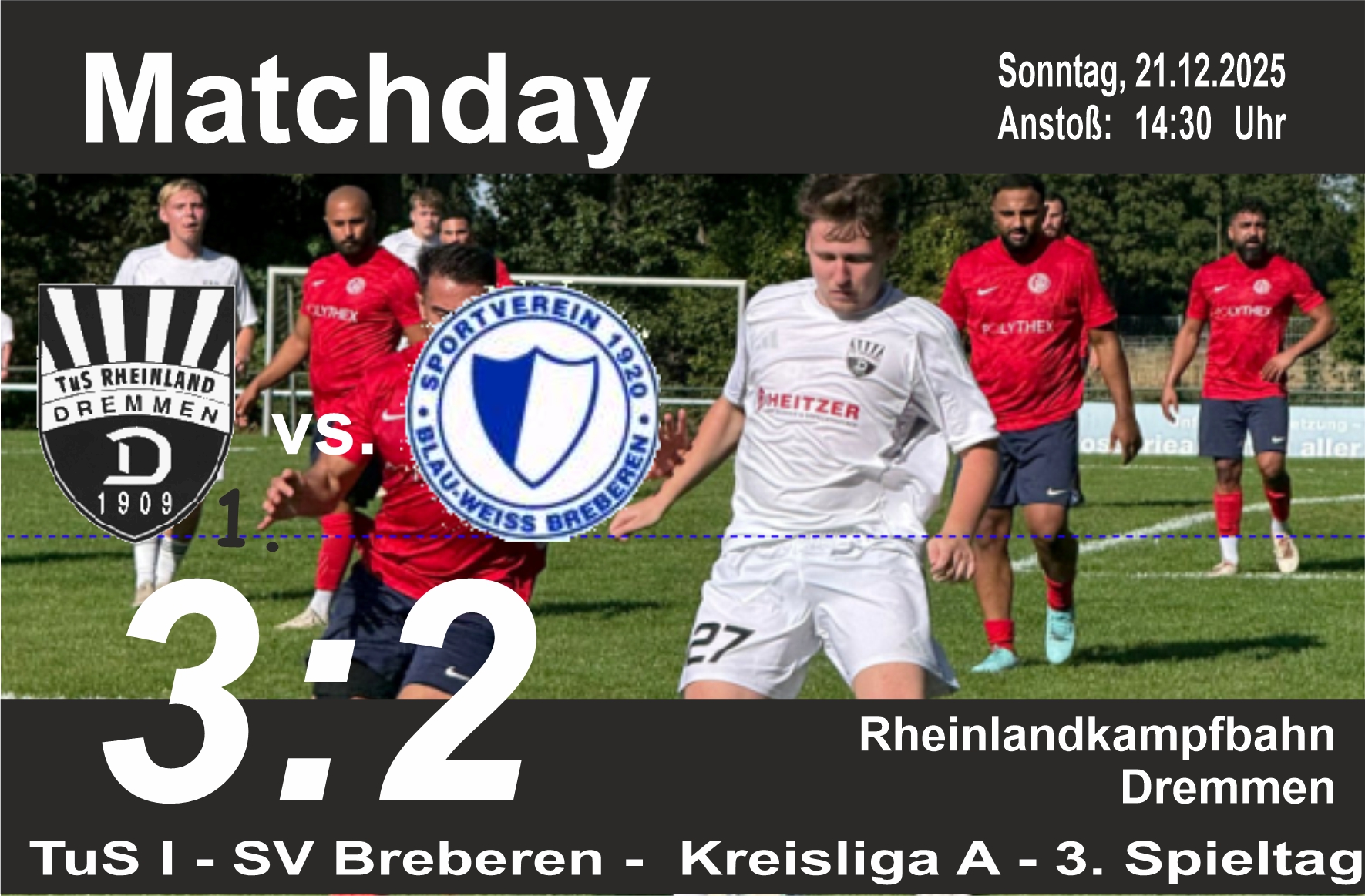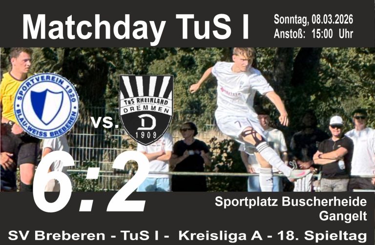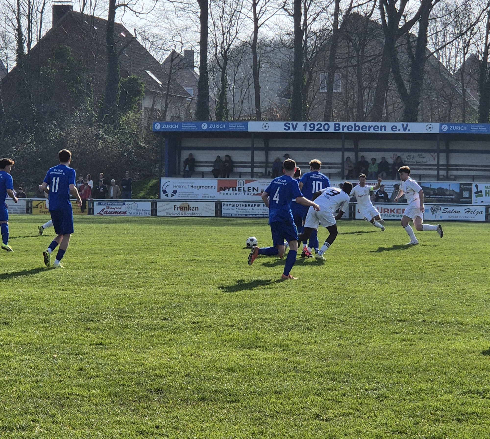 Bryan Dahlmanns brachte das Team von Trainer Kevin Jansen in der 21. Spielminute in Führung. Mit einem schnellen Doppelpack (36./41.) zum 2:1 schockte Felix Senft den Gast und drehte das Spiel. Der SV Breberen nahm die knappe Führung mit in die Kabine. Frederic Fell brachte den Ball zum 3:1 zugunsten der Mannschaft von Trainer Yustin Finlay über die Linie (65.). Der Gastgeber musste den Treffer von Sascha Schopphoven zum 2:3 hinnehmen (68.). Der SV Breberen drehte auf, Senft (79.), Maurice Winkens (82.) und Leon Bienwald (87.) markierten innerhalb weniger Minuten die Tore zum 6:2 und ließen den TuS Rheinland Dremmen dabei ziemlich alt aussehen. Letztlich feierte der SV Breberen gegen den TuS Rheinland Dremmen nach einer überzeugenden Darbietung einen verdienten 6:2-Heimsieg.