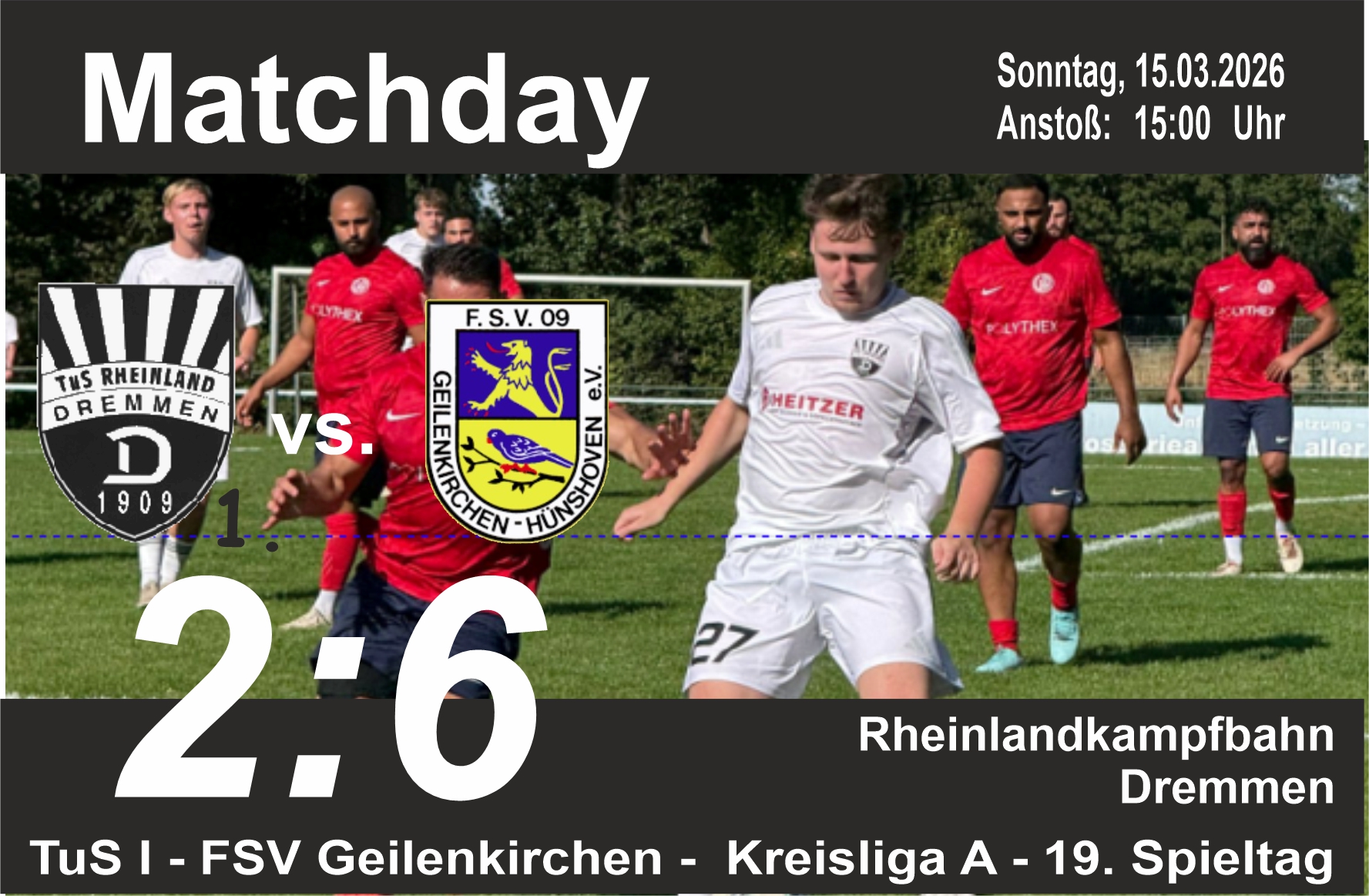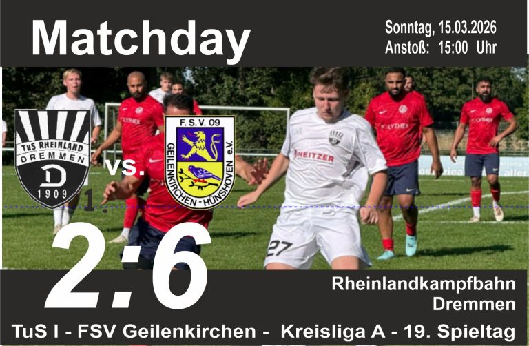 Der FSV 09 Geilenkirchen erwischte einen Blitzstart ins Spiel. Marin Blajic traf in der dritten Minute zur frühen Führung. Philipp Heinrichs erhöhte den Vorsprung des Gasts nach 18 Minuten auf 2:0. Das letzte Tor der turbulenten Startphase markierte Mats Winkens in der 27. Minute. Bis zur Pause fiel kein weiteres Tor, sodass das Ergebnis noch Bestand hatte, als sich die Teams in die Pause verabschiedeten. In der 52. Minute erzielte Frederic Nowos das 2:2 für den TuS Rheinland Dremmen. Der FSV 09 Geilenkirchen drehte auf, Niklas Jansen (65.), David Strank (69.) und Gery Wembolua Olenga (75.) markierten innerhalb weniger Minuten die Tore zum 5:2 und ließen den TuS Rheinland Dremmen dabei ziemlich alt aussehen. In der 69. Minute stellte der TuS Rheinland Dremmen personell um: Per Doppelwechsel kamen Yannick Plum und Maximilian Reitmaier auf den Platz und ersetzten Nowos und Mazir Said. Alex Gieswein wollte die Heimmannschaft zu einem Ruck bewegen und so sollten Felix-Maximilian Wenke und Michele Ott eingewechselt für Soulaymane Sadiki und Sebastian Jozef Burylo neue Impulse setzen (80.). Ehe der Abpfiff ertönte, war es Heinrichs, der das 6:2 aus Sicht des FSV 09 Geilenkirchen perfekt machte (90.). Mit Ablauf der Spielzeit schlug der FSV 09 Geilenkirchen den TuS Rheinland Dremmen 6:2.