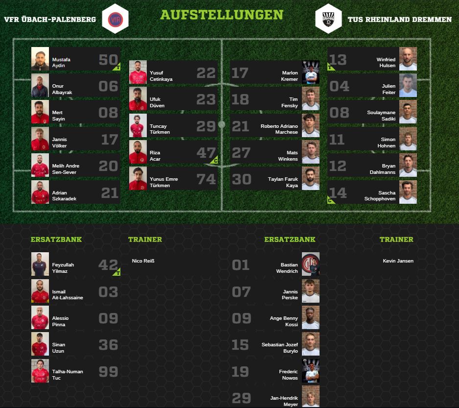 VfR Übach-Palenberg erwischte einen Blitzstart ins Spiel. Ufuk Düven traf in der zweiten Minute zur frühen Führung. Tuncay Türkmen brachte den Ball zum 2:0 zugunsten der Mannschaft von Trainer Nico Reiß über die Linie (28.). Eine Niederlage war nicht nach dem Geschmack von Kevin Jansen, der noch im ersten Durchgang Ange Benny Kossi für Julien Feiter brachte (40.). Die Hintermannschaft des TuS Rheinland Dremmen ließ bis zur Pause kein weiteres Tor zu und es ging bei unverändertem Stand in die Kabinen. Mit einem Doppelwechsel wollte der Gast frischen Wind in das Spiel bringen und so schickte Kevin Jansen Frederic Nowos und Jannis Perske für Marlon Kremer und Bryan Dahlmanns auf den Platz (68.). Für ruhige Verhältnisse sorgte Ismail Ait-Lahssaine, als er das 3:0 für VfR Übach-Palenberg besorgte (77.). Sascha Schopphoven versenkte den Ball in der 80. Minute im Netz der Heimmannschaft. Schlussendlich verbuchte VfR Übach-Palenberg gegen den TuS Rheinland Dremmen einen überzeugenden 3:1-Heimerfolg.
