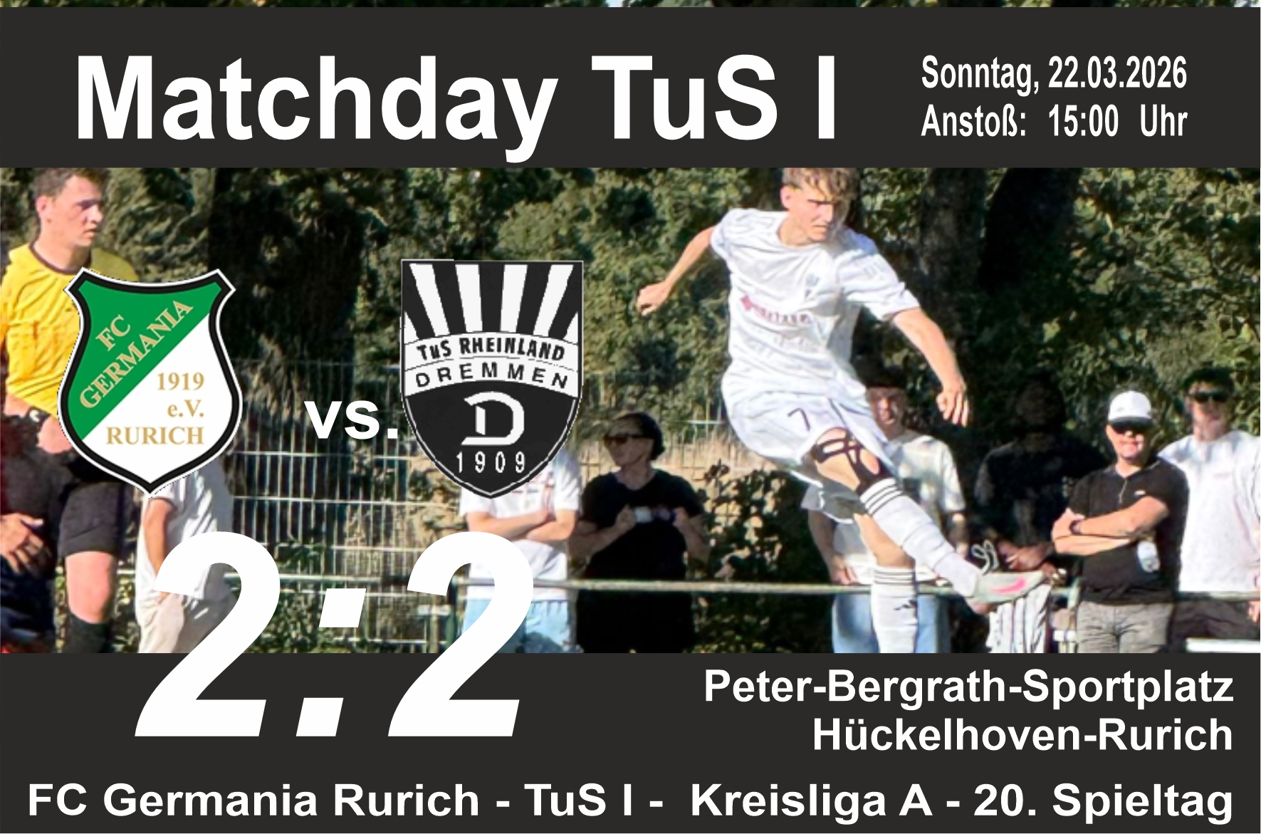 Das Spiel zwischen FC Germania Rurich 1919 e.V. und dem TuS Rheinland Dremmen endete 2:2. Wer im Aufeinandertreffen die Nase vorn haben würde, war vorab schwer auszumachen. Die Ausgeglichenheit zwischen den beiden Mannschaften zeigte sich letztlich im Endergebnis. Das Hinspiel hatte der TuS Rheinland Dremmen durch ein 2:0 für sich entschieden.