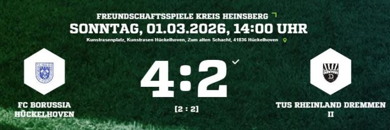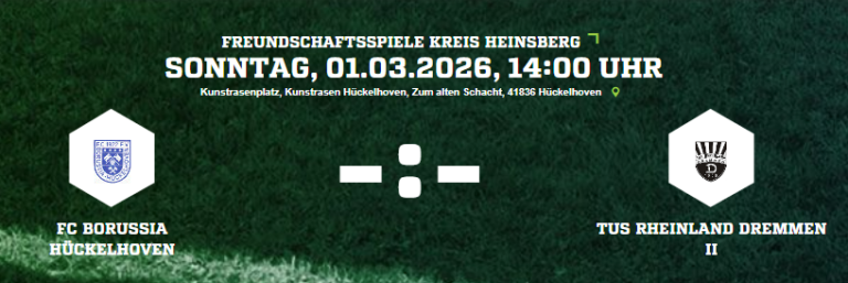 Im letzten Testspiel vor dem Meisterschaftsbeginn am nächsten Sonntag spielt die Zweite bei Borussia Hückelhoven. Hückelhoven ist Tabellenführer der C-Liga Stafffel 1 und auf dem besten Weg den Aufstieg in die B-Liga zu schaffen. Ein echter Prüfstein also für den TuS bevor es in der kommenden Woche in Haaren wieder um Meisterschaftspunkte geht.