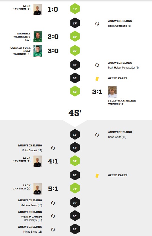 Zweite Halbzeit: Nach Wiederanpfiff zeigte Dremmen II ein kurzes Lebenszeichen: Robin Gottschald erzielte in der 46. Minute das 1:5 und brachte sein Team zumindest kurzfristig ins Spiel zurück. Doch Kempen II antwortete prompt. Nur acht Minuten später traf erneut Markus. Wilms zum 1:6 (54.).