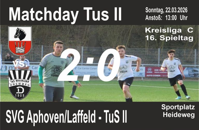 Doch der TuS fuhr trotzdem Selbstbewusst zu diesem Spiel und wollte dem Favoriten ein Bein stellen. Doch Aphoven/Laffeld drängte früh auf die Führung. Zwei Chancen in den ersten Minuten zeigten, dass Aphoven auf die frühe Führung aus ist. Der TuS kam erstmals nach knapp 15 Minuten gefährlichs vor das Tor des Gastgebers und traf sogar, doch das Tor wurde wegen einer Abseitsstellung nicht gegeben. Fast im Gegenzug ein Pforstenschuss von Aphoven. Besser machten es die Gastgeber dann nach 19 Minuten und gingen durch Niclas Winkens in Führung. Die Chance auf das 2:0 vereitelte Torhüter Marvin Braun mit einer starken Parade. Nach dem Wechsel drängte der TuS auf den Ausgleich, doch große Torchancen konnte sich das Team nicht herausspielen. Auch bei den Gastgebern tat sich nicht viel, bis zur 71.Minute. Dann traf Yannik Schröder mit einem direkt verwandelten Freistoß. Damit war das Spiel entschieden. Der TuS hätte in der 84. Minute nochmal für Spannung sorgen können, doch ein Schuss landete an der Latte des Aphovener Tores. Kurz vor dem Ende nochmal die Chance zum Anschluss, doch diesmal parierte der Torhüter, so dass es am Ende beim 2:0 Erfolg für den Favoriten blieb.